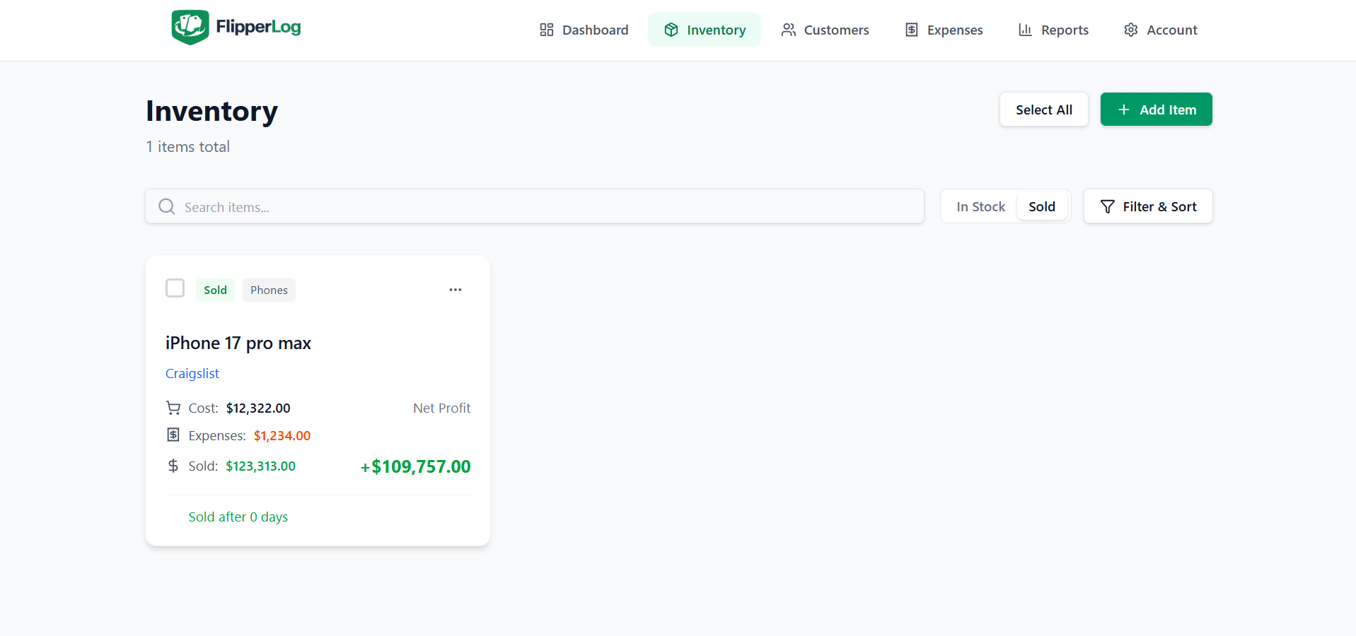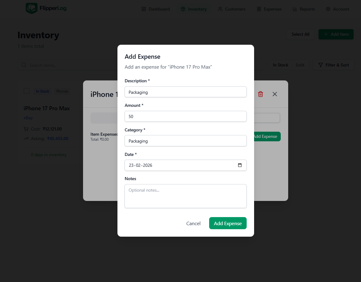 Link expenses directly to an item (shipping, repairs, platform fees, parts) or track overhead separately (storage, tools, subscriptions). Item expenses reduce that item’s profit; overhead is included in your overall net profit. The dashboard formula is: Net profit = Revenue − COGS − item expenses − overhead.