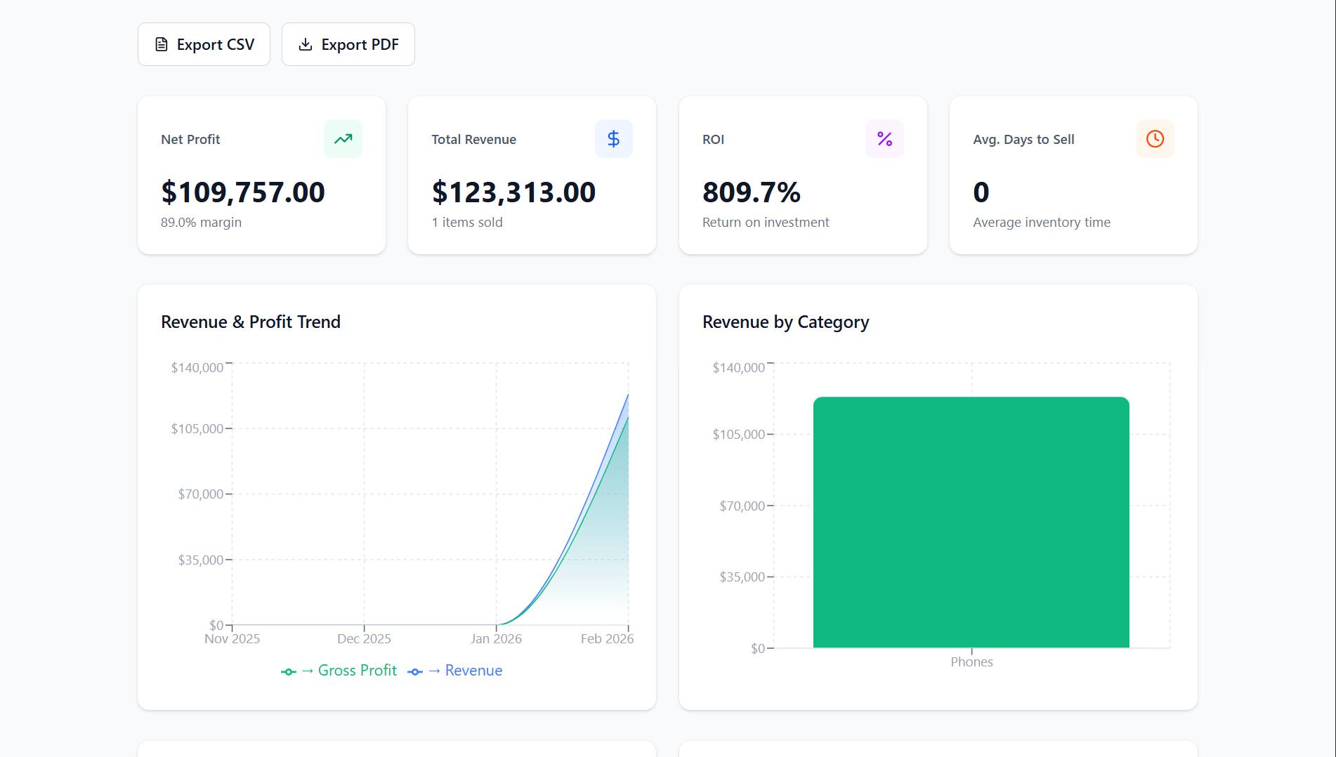 Reports show profit trends over time, category breakdown, and platform performance. Choose date ranges (e.g. last month, last 3 or 6 months). Export to CSV for spreadsheets or PDF for records and accountants. All data respects your default currency.