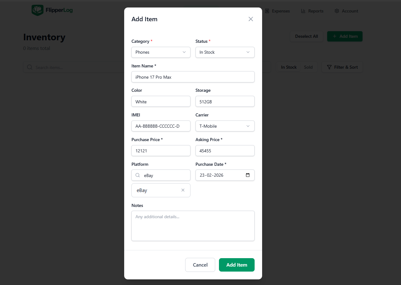 When you add an item, you choose a category. The form adapts so you only see relevant fields: cars get year, make, model, trim, VIN, and color; phones get IMEI, storage, color, and carrier; shoes and clothes get size. Every item has name, purchase price, platform, and notes.